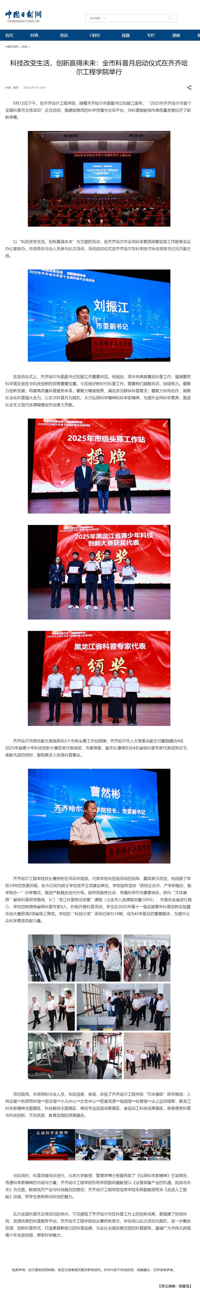 《中国日报网》科技改变生活,创新赢得未来:全市科普月启动仪式在齐齐哈尔工程学院举行