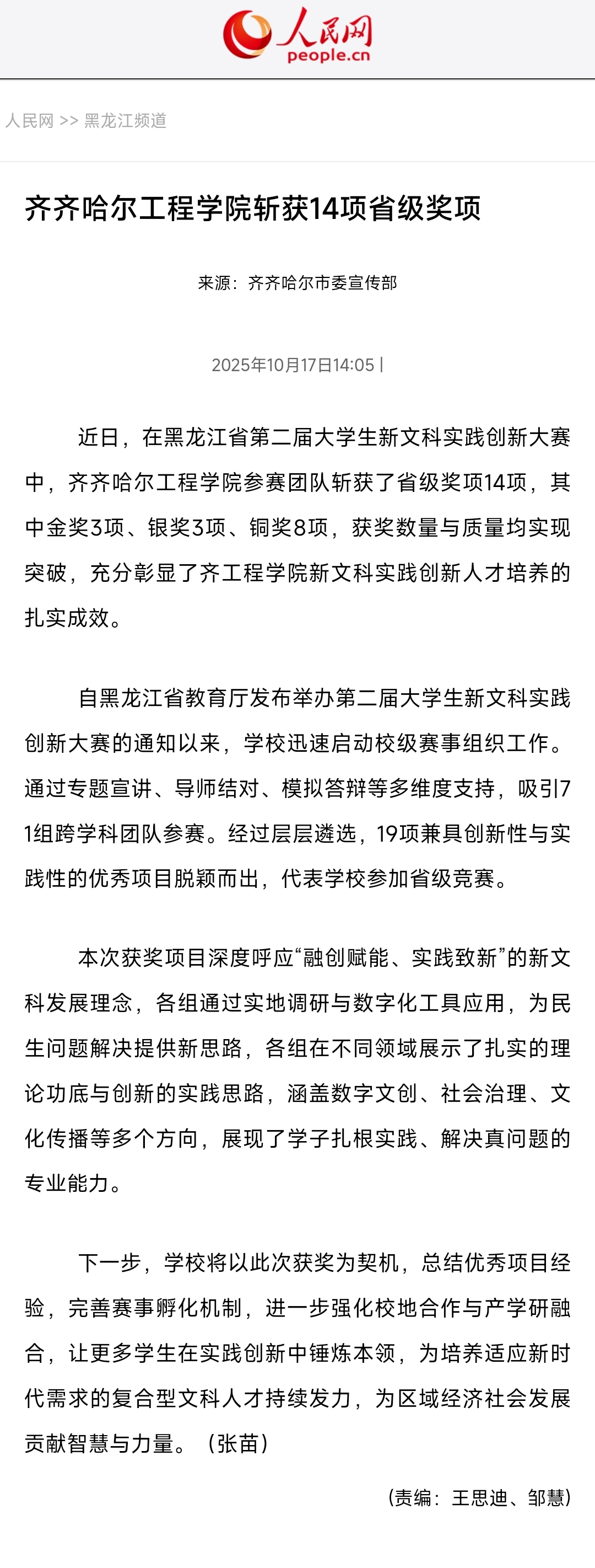 《人民网》齐齐哈尔工程学院斩获14项省级奖项