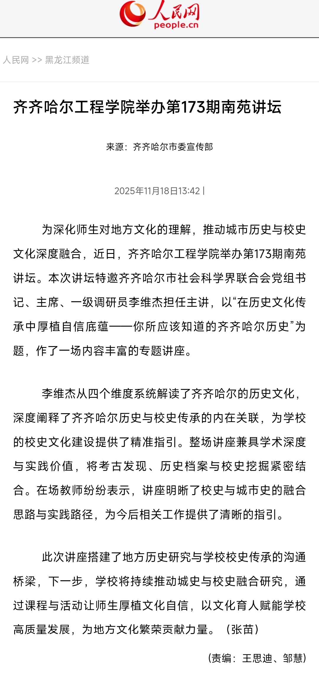 《人民网》齐齐哈尔工程学院举办第173期南苑讲坛