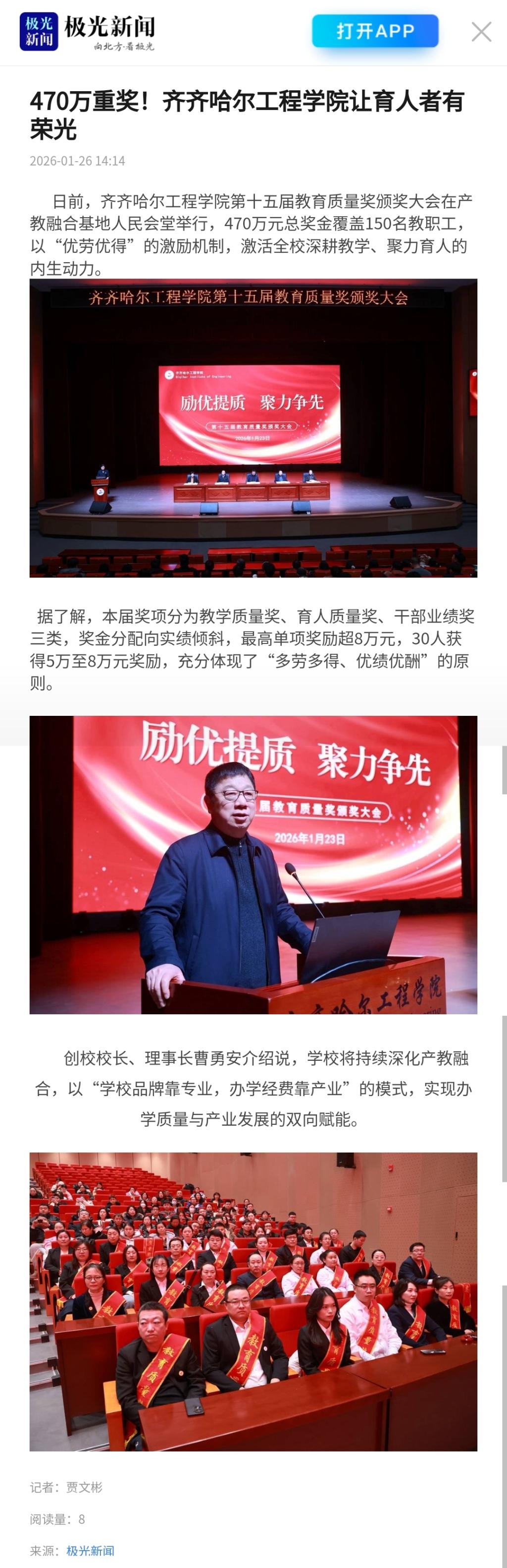 《极光新闻》470万重奖!齐齐哈尔工程学院让育人者有荣光