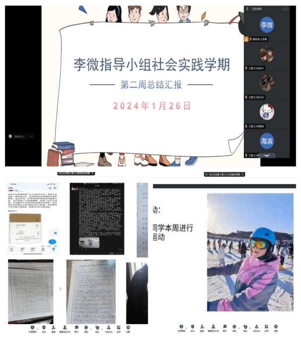 生涯导师李微:1月26日下午,生涯导师李微线上召开社会实践学期总结汇报会,会议由工管211班房芯仪同学主持,指导小组全体同学参加。会上,各小组采用ppt的形式详细总结了第三周各个项目完成情况,李微针对各小组的具体情况分别进行指导,对调查研究报告的撰写以及每一部分的要求进行了讲解,特别强调了新闻报道方面问题,稿件质量还需提高。李微指出,大家不要为了完成任务而完成任务,要通过每个项目的完成能够有所收获,对于存在的问题要及时改正,取长补短,这样才能使社会实践学期更有意义。