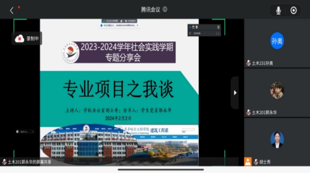 生涯导师胡士秀:2月2日,生涯导师胡士秀通过腾讯会议召开2023-2024学年社会实践学期“专业项目之我谈”的专题分享会,社会实践学期5个小组的学生在线参加了会议。本次专题分享会的召开主要针对社会实践学期开设近一个月,胡士秀针对个别学生存在的对专业项目“不知如何开展”的问题,邀请助教,即党员学长郭永华进行经验分享。会上,胡士秀希望同学们能够与党员学长建立良好的联系,充分发挥从生涯导师到党员学长,再到小组组长,最后使全体学生受益的团队合作的作用,在今后的社会实践学期各项目中能够互通有无,共同进步。
