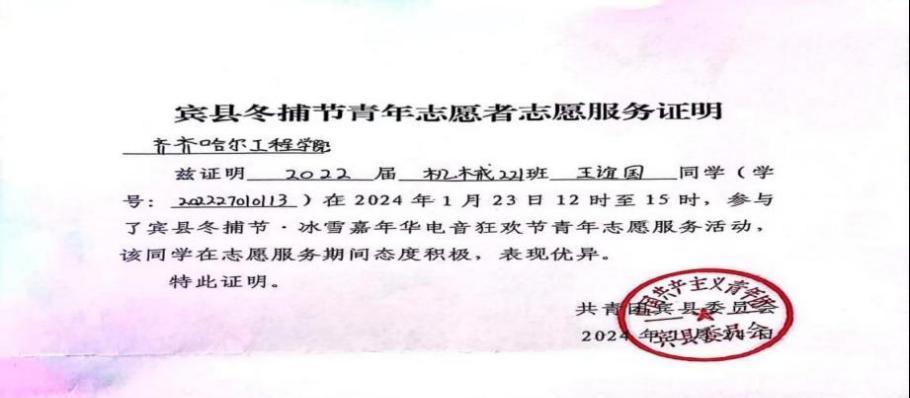 寒假期间,机械专业212班王谊国同学参加了宾县团县委组织的“返家乡”冬捕节志愿服务活动。在一年一度的冬捕节现场,王谊国和大学生们一起参与到现场布置、维护秩序等工作当中。火红的旗帜和志愿者标识,在皑皑白雪的映衬下格外醒目,也展现出当代大学生积极向上的精神风貌。来自四面八方的游客在体验冬捕文化、领略冰雪魅力的同时,也感受到了东北的温度与热情。
