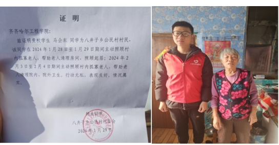 马企东等同学前往大庆市八井乡公民村看望留守老人,为老人清理室外积雪,打扫室内卫生,给爷爷奶奶创造一个干净整洁的生活环境。并与老人谈心,关注他们的生活状况。老人感动地说:“感谢你们来看我们,帮我们收拾屋子打扫卫生,奶奶不图你们带什么东西,你们能来看看奶奶、陪奶奶聊聊天,就感觉到特别开心了。”