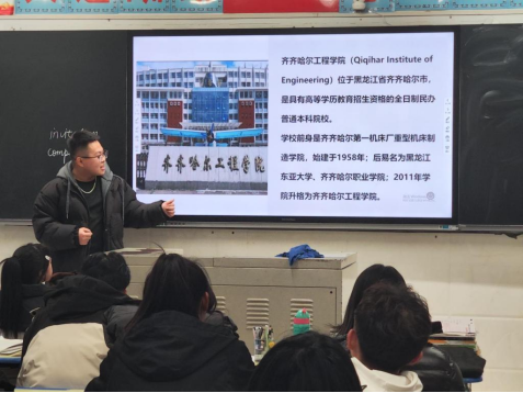 建筑工程系土木221班王旭阳同学回到母校五大连池市沾河高级中学,见到了高中班主任王凤娟老师和学弟学妹,王旭阳同学用PPT向老师、同学介绍了齐齐哈尔工程学院建校三十余年的光荣历史和优良传统,展示了学校正在建设中的校园北区以及未来美好的发展前景,分享了大学的生活经历和取得的成绩。