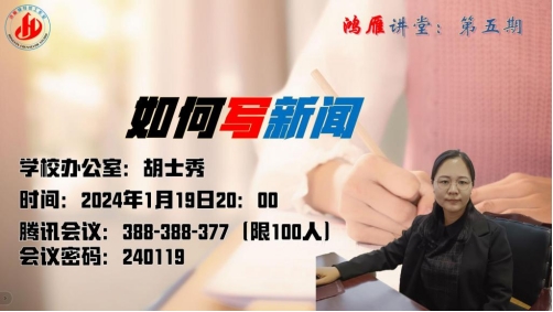 建筑工程系邀请生涯导师、学校办公室胡士秀老师针对学生在撰写新闻稿件时存在的问题,举办“鸿雁讲堂”暨“2023-2024学年度社会实践学期专题讲座”--《如何写新闻》。胡士秀根据学校官网投稿新闻的标准和建筑工程系社会实践学期新闻的标准,详细阐释了新闻要素、稿件格式、新闻照片拍摄技巧与尺寸要求等方面的知识,并选择学生发表的实际新闻案例进行对比讲解,令学生受益匪浅。
