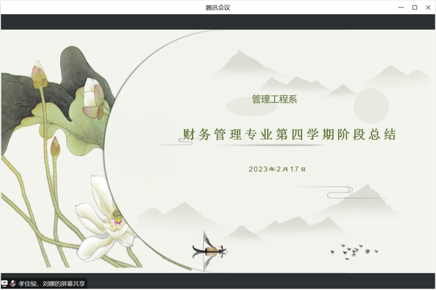 管理工程系财务管理专业于2月17日在线召开“第四学期阶段总结会”。辅导员孝佳骏、刘娜、马钰舒以及财管20、21、22级部分学生代表参会。