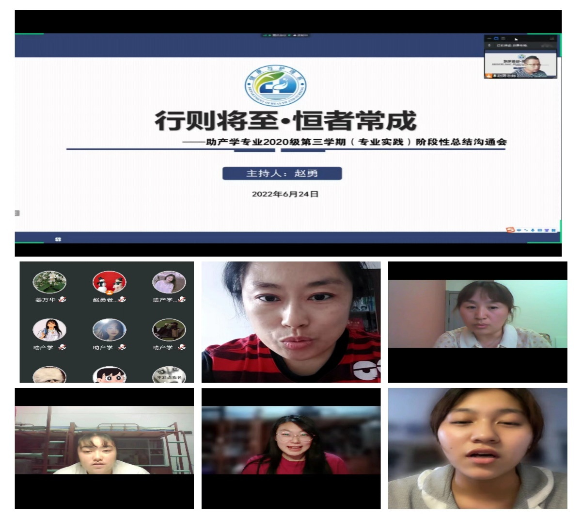 6月24日晚上,辅导员赵勇采用腾讯会议的方式组织助产学专业第三学期实践学生对第二周实习情况进行阶段性总结。助产学专业生涯导师张晓波,第三学期专业指导教师姜万华、黄丹、张蕾参会。