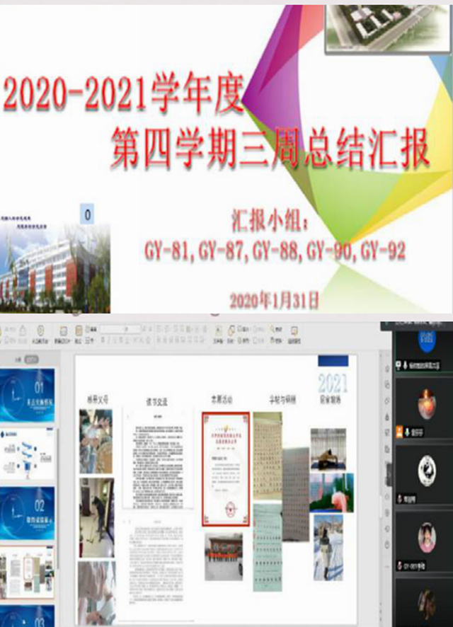 1月31日晚19:00时,信息工程系第四学期GY-81、GY-87、GY-88、GY-90、GY-92五个小组成员,在线上召开了第四学期第三周实习总结汇报会。会议由指导教师雷莎莎主持,各小组成员参加了会议。