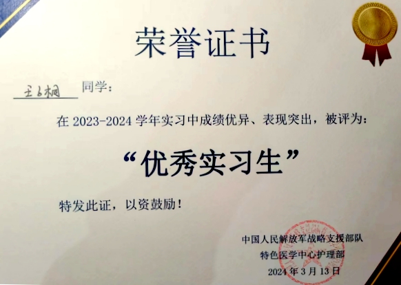 在中国人民解放军战略支援部队特色医学中心实习的护理学206班张泉灵、王子桐两名学生荣获“优秀实习生”荣誉称号。
