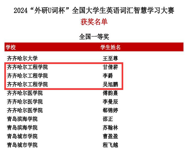 词海扬帆,智慧领航。近日,由外语教学与研究出版社主办的首届“外研U词杯”全国大学生英语词汇智慧学习大赛落下帷幕,经过竞赛激烈的角逐,我校共56名学生取得优异成绩,甘倩菥、李爵、吴旭鹏3人荣获比赛一等奖;蔡颖欣、陈睿等15名学生荣获比赛二等奖;曾文强、段宏达等38名学生荣获三等奖,获奖颇丰。