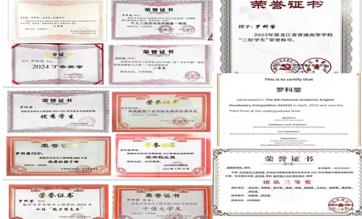 在专业实践方面深知当代社会对于高素质、高水平复合型人才的迫切需要,作为土木学子,更要注重实践、提升技能。课余时间,她利用中国大学慕课、我要自学网、广联达等各大学习平台,自学与专业相关的软件操作,努力提升专业能力和技术水平。为将学到的知识运用到实践中,她积极参加校内各种技能比赛以及兴趣小组,做到理论与实践相结合,巩固专业理论知识,增强动手能力,并荣获“卓尔不群”组织管理创新能力大赛“二等奖”、测量实践技能大赛“个人三角形内角和测量”一等奖、2024年“筑梦杯”大学生建筑创新大赛“三等奖”等称号