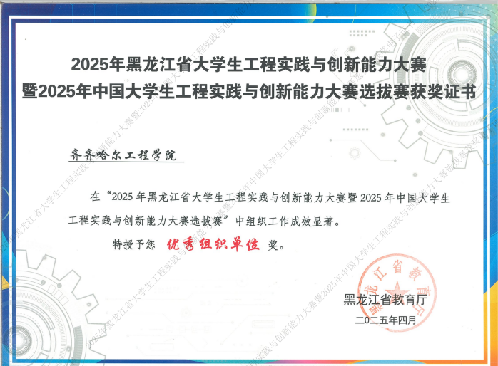 近日,由黑龙江省教育厅主办、哈尔滨工业大学承办的2025年黑龙江省大学生工程实践与创新能力大赛暨2025年中国大学生工程实践与创新能力大赛选拔赛圆满落下帷幕。我校在此次比赛中表现突出,斩获工程创客赛道工程文化赛项、智能机电产品创新设计赛项与全地形赛项特等奖3项、一等奖6项、二等奖4项,虚拟仿真赛道企业运营仿真赛项一等奖1项、二等奖4项,“智能+”赛道智能物流搬运赛项与生活垃圾智能分类赛项二等奖各1项,新能源车赛道太阳能电动车赛项二等奖2项;5位教师获“优秀指导教师”称号;学校在此次赛事中荣获“优秀组织单位”。