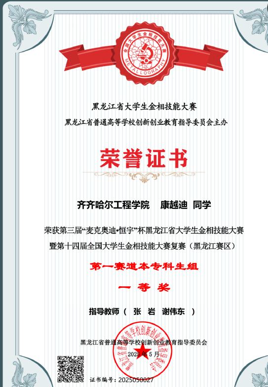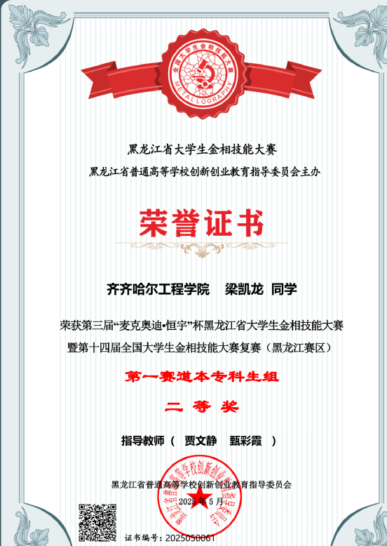 近日,在哈尔滨理工大学举行的第三届“麦克奥迪·恒宇”杯黑龙江省大学生金相技能大赛暨“徕卡”杯第十四届全国大学生金相技能大赛复赛(黑龙江赛区)传来喜讯,我校机电学院6名参赛学生均获奖项,其中:获一等奖1人、二等奖1人、三等奖4人,3人晋级国赛。机电学院张岩老师获得优秀指导教师称号。我校是第一次参加此项赛事,此次获奖充分展示了机电学院在人才培养方面的显著成效。