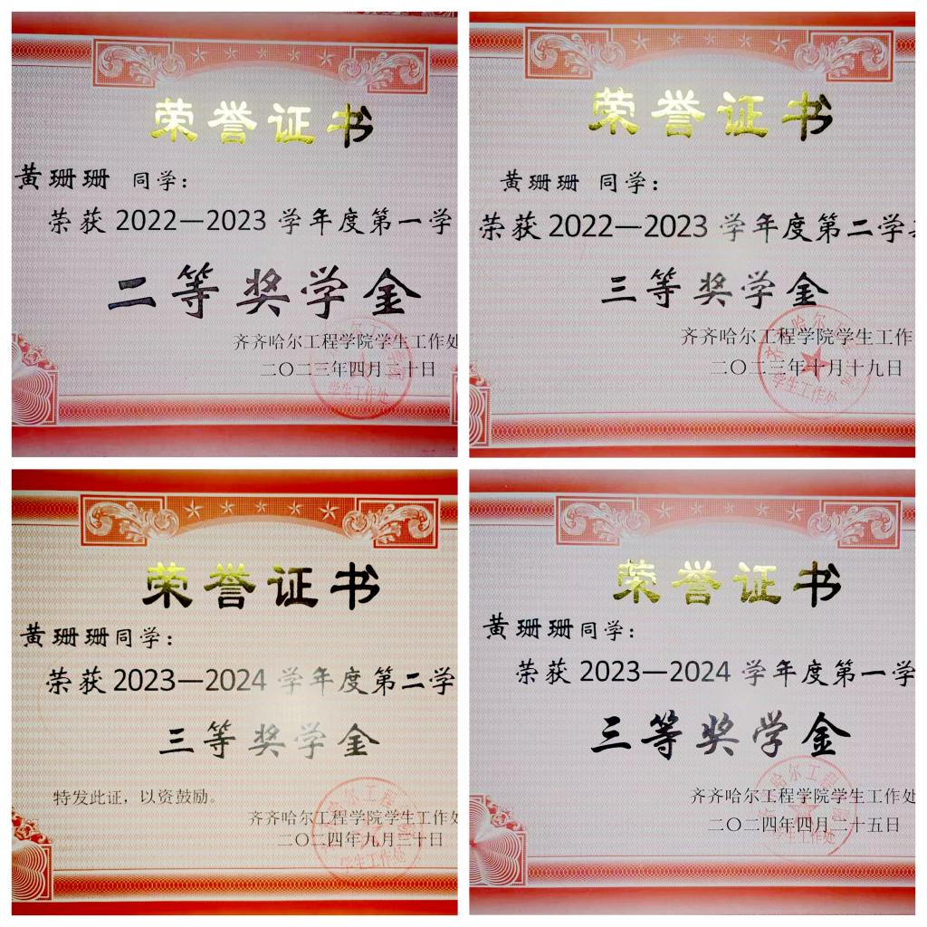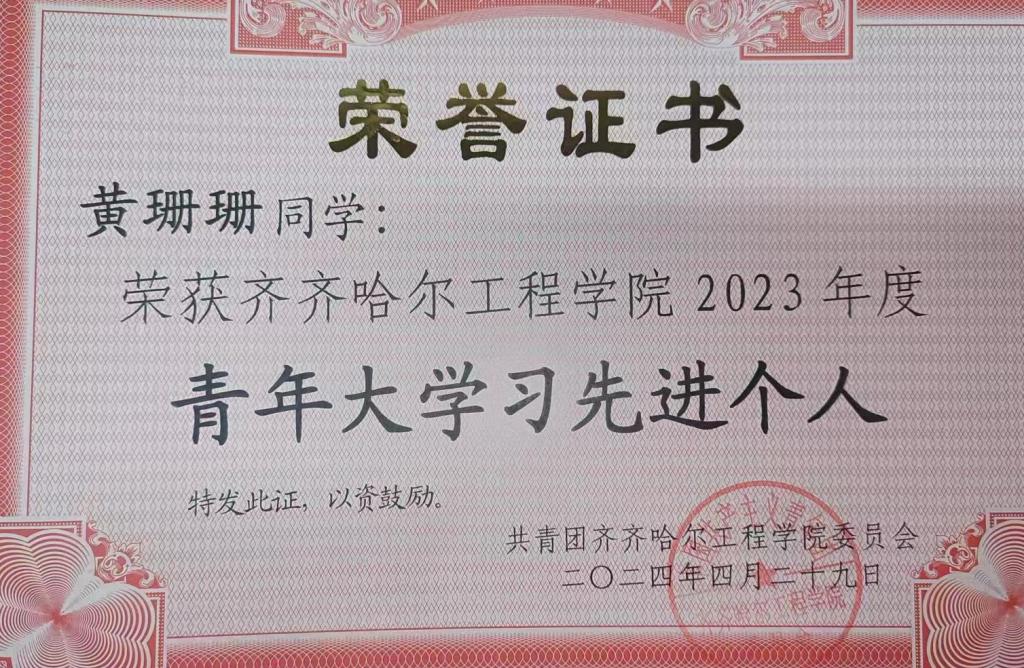 黄珊珊在思想上始终保持积极进取的态度,她深知理论学习的重要性,不仅认真参加思想教育活动,还主动通过多种渠道加强理论学习,不断提升自身的思想修养。在生活中,她更以实际行动发挥带头作用,积极带动身边同学共同进步,并荣获齐齐哈尔工程学院 2023 年度“青年大学习先进个人”称号。