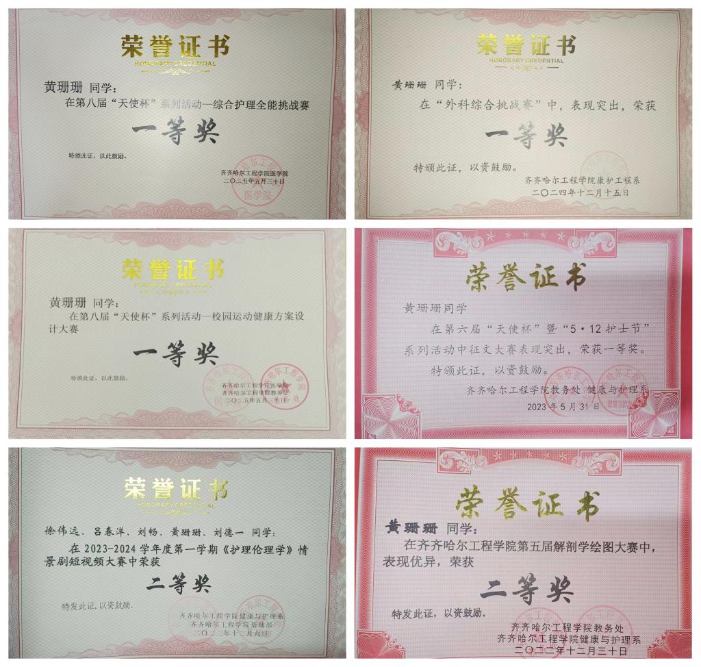 黄珊珊在专业学习和竞赛中表现突出。在2024-2025学年第二学期举办的综合护理全能挑战赛中,她以扎实的专业技能和稳定的临场表现,获得大赛一等奖。在第六届“天使杯”暨“5·12护士节”中文征文大赛中,她从护理人文关怀视角出发,用真挚的文字记录护理工作的点滴,表达了对护理事业的热爱,让更多人感受到护理工作的温度与深度,出色的文笔和真情实感让她斩获一等奖;在第五届解剖学绘图大赛中,她凭借扎实的解剖学知识和细致的绘图技巧获得二等奖;在基础护理技能大赛上,她通过反复练习操作流程、规范每个动作细节,荣获三等奖,为未来的临床工作打下了坚实基础。