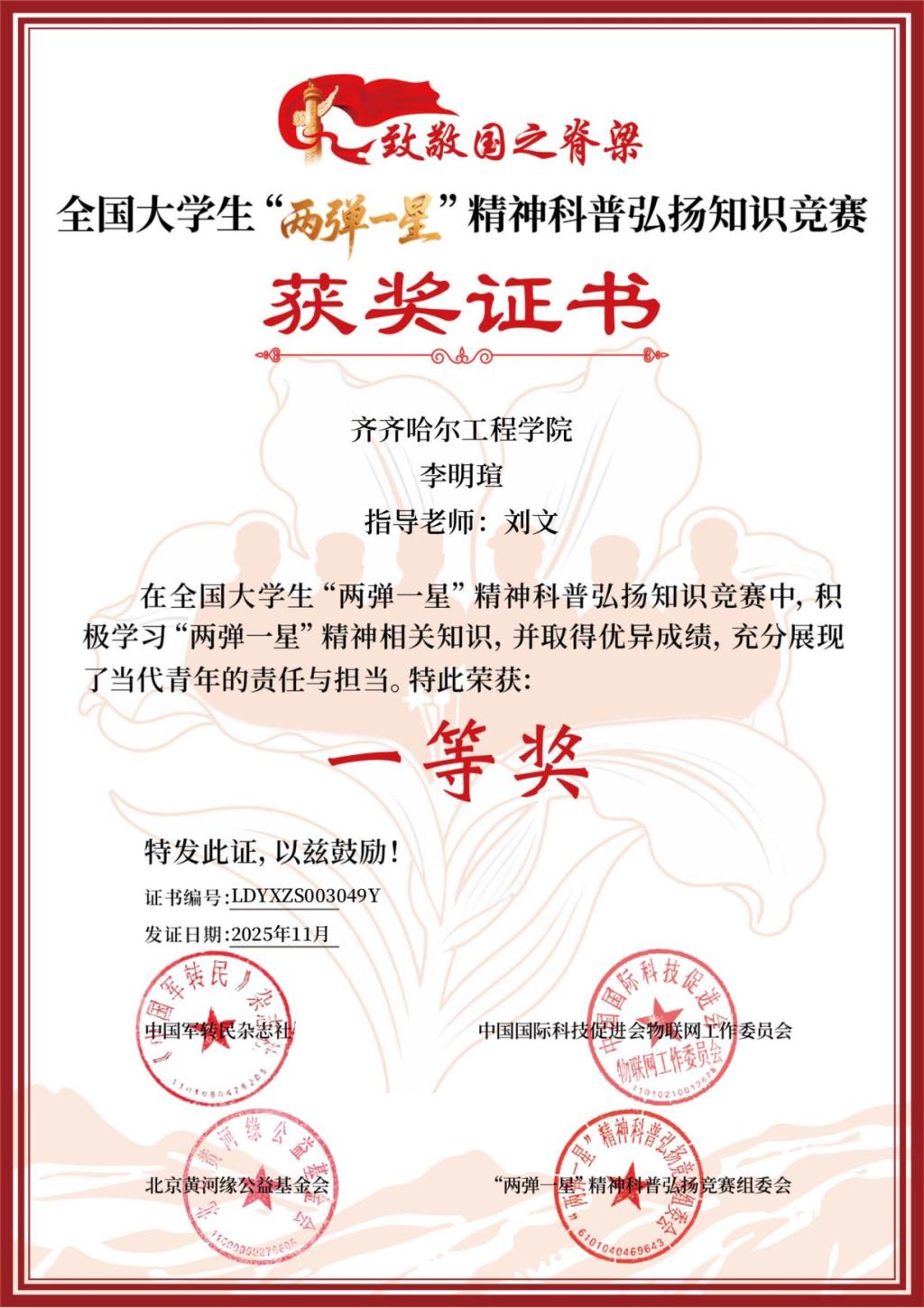 近日,全国大学生“两弹一星”精神科普弘扬知识竞赛圆满落幕。通识教育学院大学物理教研室以课程思政建设为抓手,组织全校150名学生参赛。最终8名学生荣获一等奖、15名学生获得二等奖、30名学生获得三等奖,其余学生均获得优秀奖,展现了我校学子的家国情怀与科学素养。