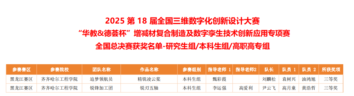 【喜报】我校在2025年第18届全国三维数字化创新设计大赛“华教&德荟杯”增减材复合制造及数字孪生技术创新应用专项赛全国总决赛中斩获佳绩