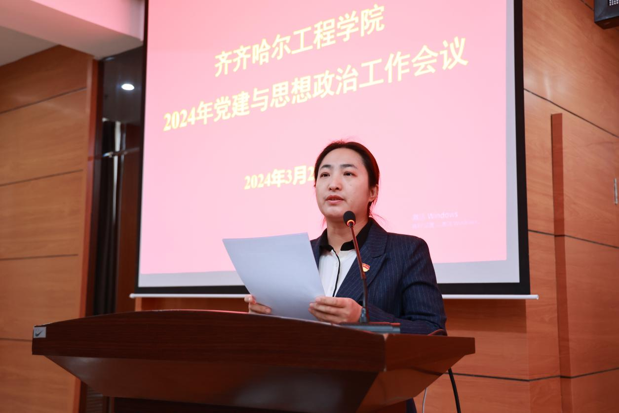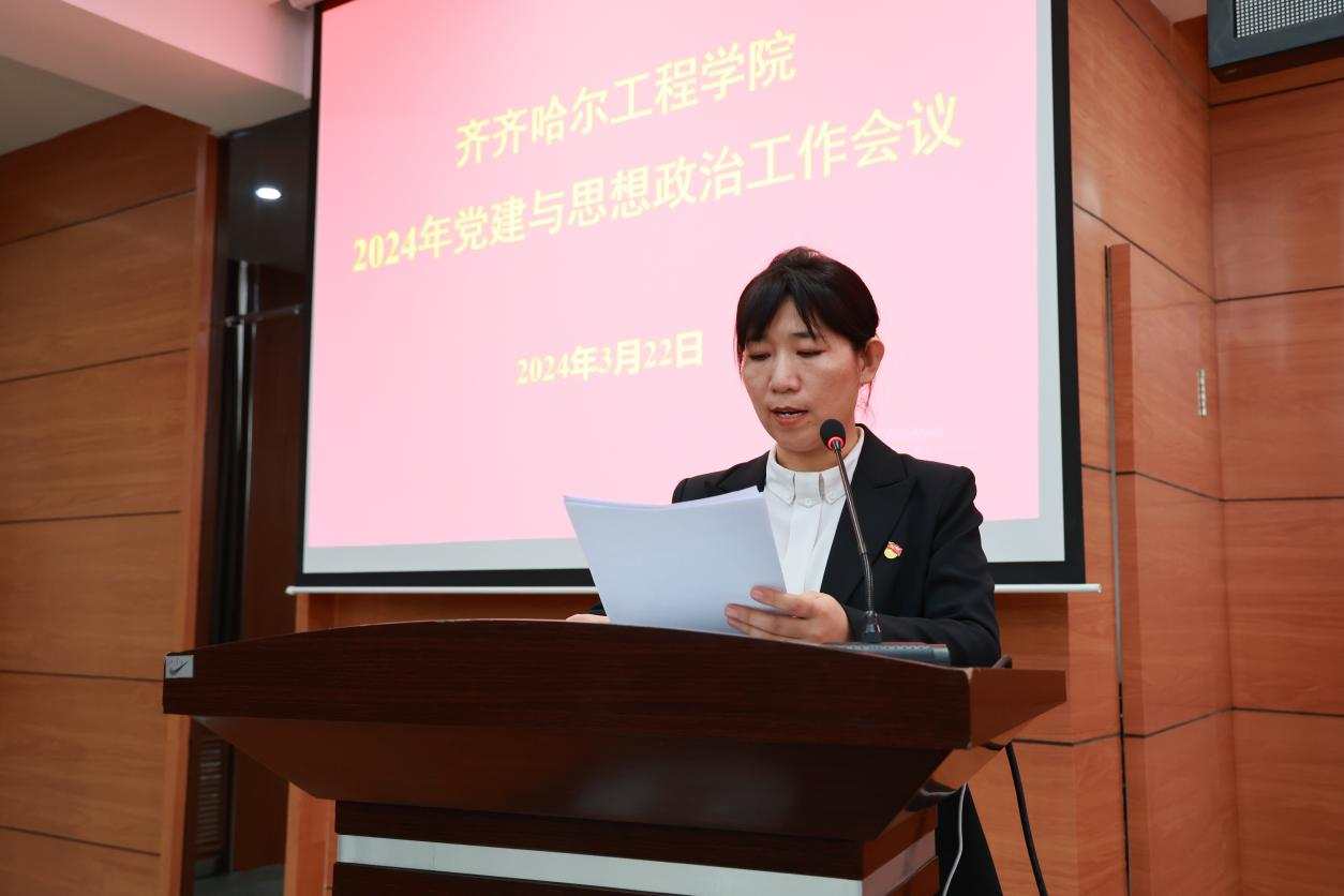 党委委员、副院长白雪宣读《齐齐哈尔工程学院思想政治工作五年规划(2023——2027)》。