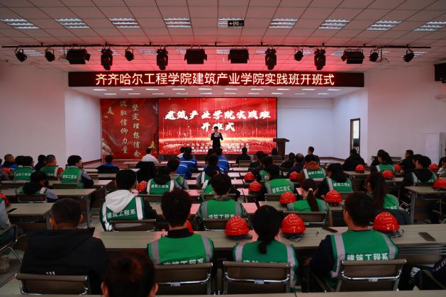 在春风拂面的三月,学校建筑产业学院迎来了一场盛大的开班仪式。3月29日下午,齐齐哈尔工程学院建筑产业学院实践班开班式在学校二教学区2508报告厅举行。学校常务副院长、建筑产业学院院长陈景鑫、副院长张静,建筑工程系党总支书记、系负责人徐明,中建二局第四建筑工程有限公司齐齐哈尔工程学院项目指挥长战乃超、书记郑永会,中国能源建设集团东北电力第二工程有限公司项目经理张德志以及产业学院骨干教师和学生代表近90余人参加。