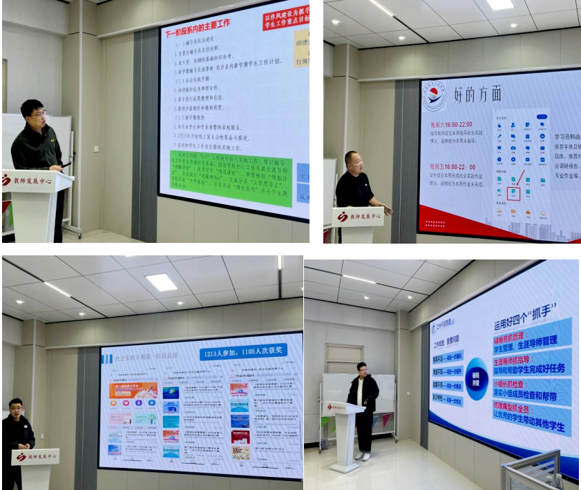 各系党总支副书记分别介绍了各系社会实践学期阶段性成果,针对完成情况、特色做法、存在问题及改进措施进行汇报。