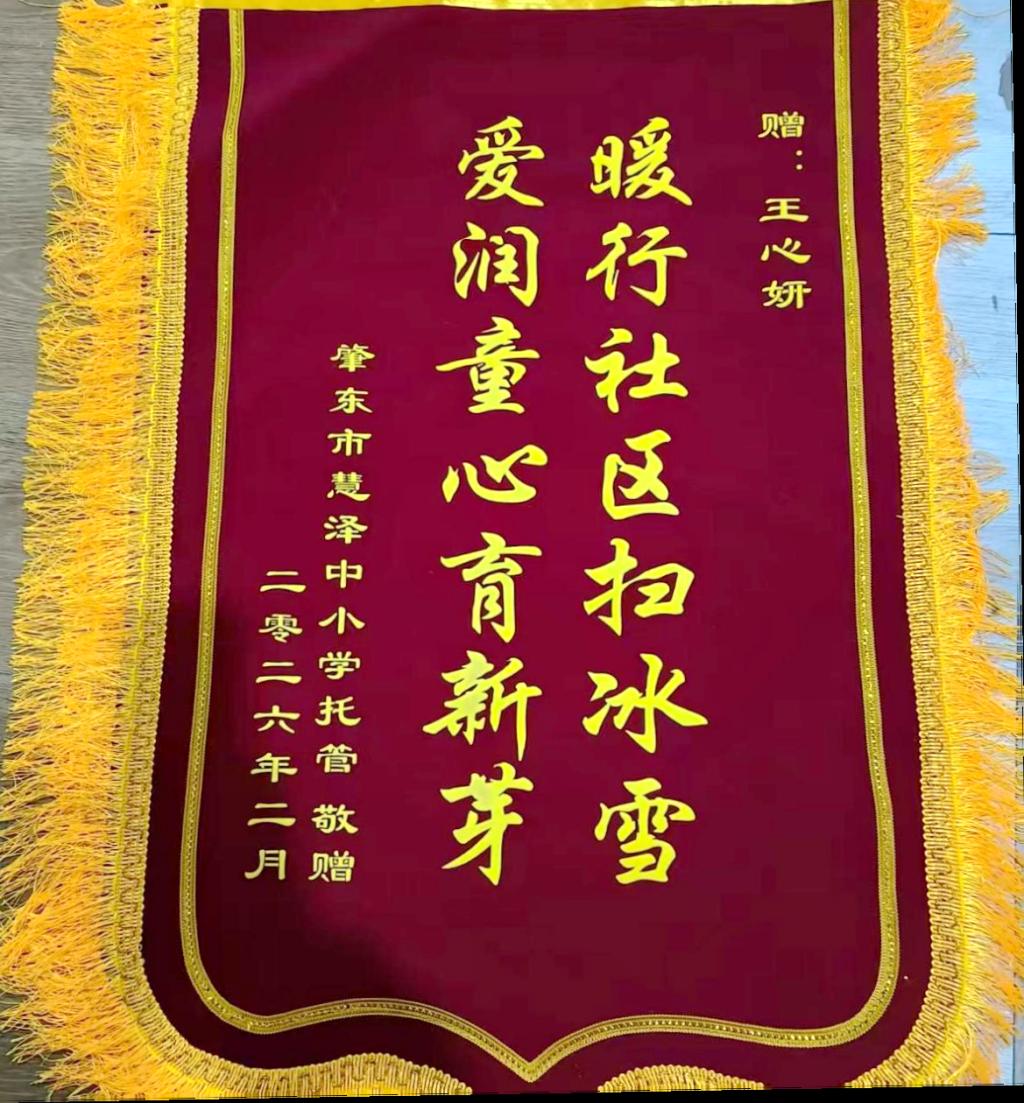 近日,机电学院学生王心妍在肇东市慧泽中小学托管机构开展“暖行社区·爱润童心”志愿实践活动。她的暖心服务得到了机构的高度认可,特别赠送了一面写有“暖行社区扫冰雪 爱润童心育新芽”的锦旗,以此感谢她的真诚付出,并赞扬齐齐哈尔工程学院在培养学生社会责任感方面的育人成效。