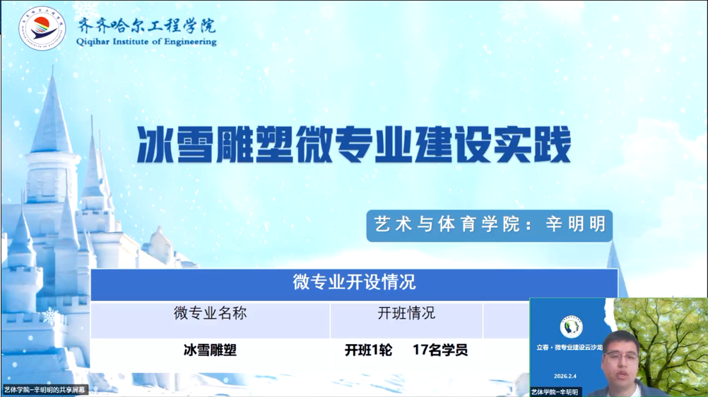 我校艺术与体育学院辛明明作题为《冰雪雕塑微专业建设实践》的分享,该微专业紧密依托黑龙江独特的冰雪资源优势,精准对接冰雪经济发展的人才需求,已完成首轮教学。17名学员系统掌握了雪雕、冰雕的核心技艺。课程体系涵盖4门课程2.5学分,凝练55个课点、12个项目,独创标准化创作流程与考核量表,牵头制定《冰雪雕刻师职业技能等级标准》。师生团队还应邀参加了黑龙江省第二届冰雕雪雕职业技能大赛,携实战教学成果登台竞技。从校园实训到哈尔滨冰雪大世界创作,该微专业实现从无到有、从课堂到顶尖艺术殿堂的跨越,为冰雪产业培养实用型人才,彰显高校服务地方经济发展的责任与担当。