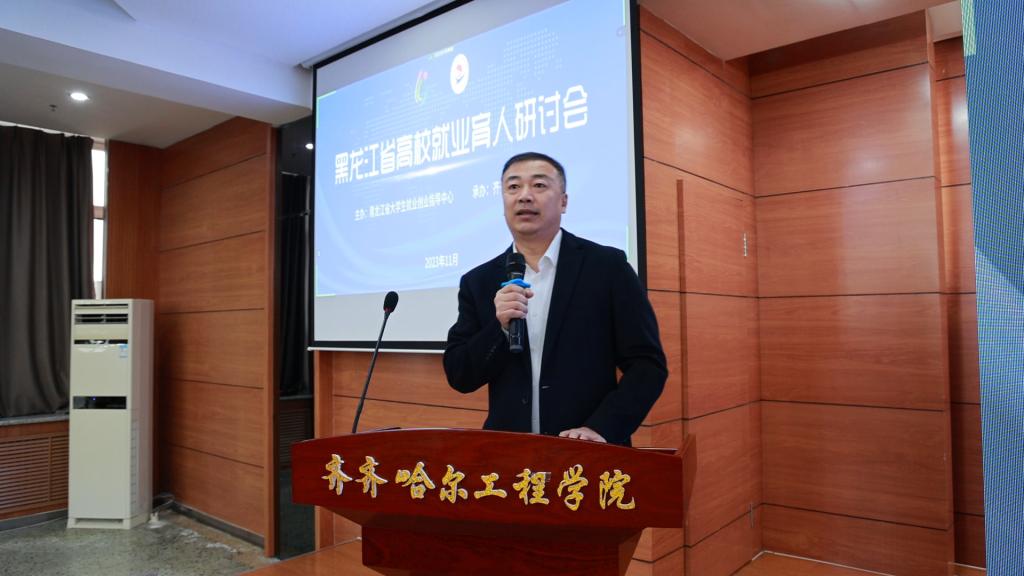 黑龙江省大学生就业创业指导中心主任郭承哲出席会议并讲话,郭承哲代表省大学生就业工作部门及全省高校,感谢省内外知名专家的莅临指导,感谢学校对本次活动做出的周到细致服务,并就加强高校就业育人工作讲三点意见:一是从宏观角度,理解和把握就业育人的内涵意蕴与时代价值;二是从现实角度,梳理和总结当前我省高校就业育人工作存在的问题;三是从指导服务角度,探索与构建就业育人的实践路径。郭承哲指出,下一步,省大学生就业创业指导中心还将通过开展省级就业创业金课遴选、就业专项课题研究、高校就业指导教师系列培训、生涯咨询公益服务等系列活动,持续为高校提供指导与服务,一如既往的与高校携手努力做好黑龙江省高校毕业生就业工作。希望各高校以本次会议为契机,树立就业育人理念,开展系列就业育人行动,营造全省就业育人氛围,推动全 省就业工作再上新台阶。