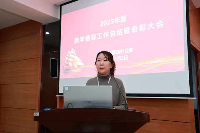校级教学督导员柏薇薇老师对2023年教学督导工作进行了全面总结,对教师教学基本功、授课方式、课堂学习氛围等明显进步的方面给予充分肯定,对存在的问题也进行了客观分析,同时也代表全面质量管理办公室对下一步的督导重点进行了详细的说明。