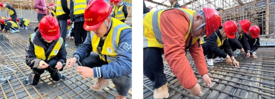 目前我系学生已经实际参与到我校校园北区建设项目地下室底板防水—模板安装—钢筋绑扎—混凝土浇筑等一系列施工工艺、工序中。如徐喜辉老师所授的《土木工程施工技术与组织》课程,徐老师将北区校园现场作为“教室”,将知识点、技能点和态度点融入到每一个工序之中,学生亲自动手,完成钢筋的绑扎工作,更深入地理解梁、板施工工艺。