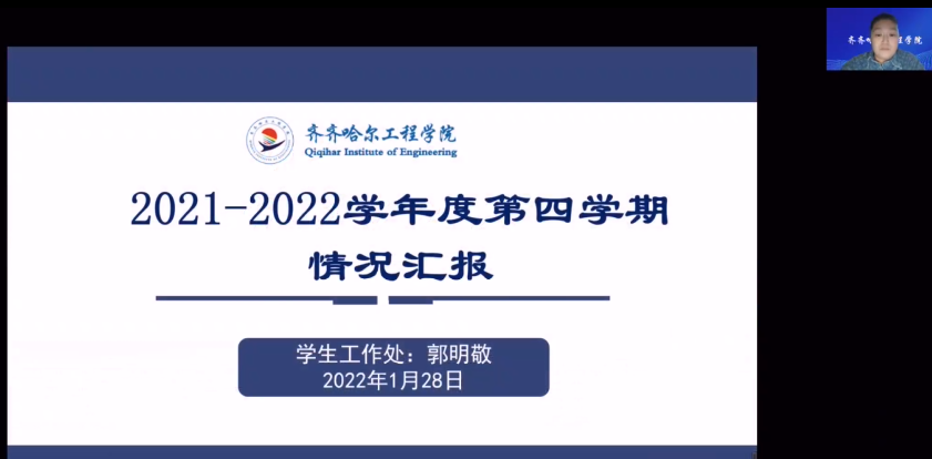根据《齐齐哈尔工程学院2021—2022学年度第四学期实施方案》的要求,1月28日下午,学校在线召开2021-2022学年度第四学期阶段总结会。副院长张振笋、建筑工程系、管理工程系主任陈景鑫、机电工程系主任郭磊、信息工程系负责人刘春媛、健康与护理系负责人郭玲玲、各系学生工作副主任及全体辅导员和学工处老师参会。会议由学生工作处副处长郭明敬主持。