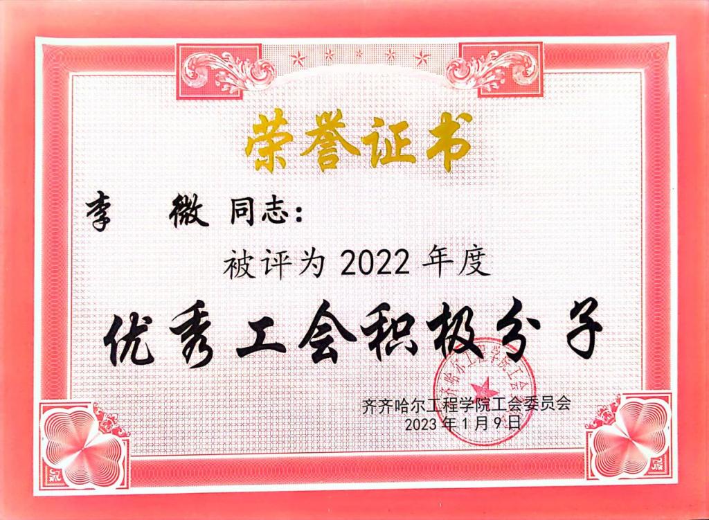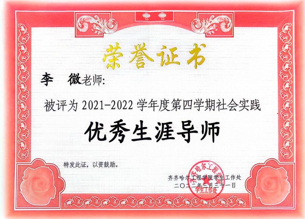她作为生涯导师,积极鼓励学生参与科研实践,培养创新思维,多次指导学生参与创新训练计划。通过比赛能够使专业知识和各项技能有所提升,在备赛过程中,尽可能地为学生提供帮助和指导。她所指导的学生多次在创新创业、学科竞赛和兴趣爱好比赛中荣获荣誉,同时,李微也多次获得优秀指导教师称号。其中工管211班章海滨获得全国2023年数字建筑创新应用大赛团队三等奖。