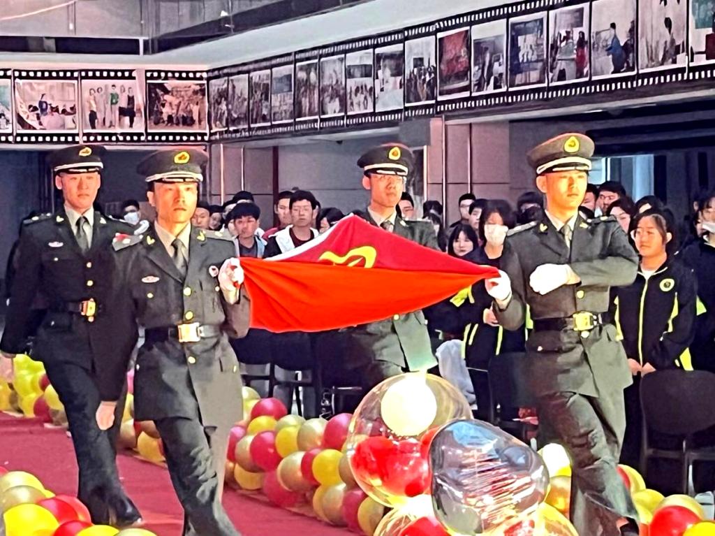 学长教官团成员迈着铿锵有力的步伐走向舞台中央,展开团旗,全体师生重温了入团誓词。
