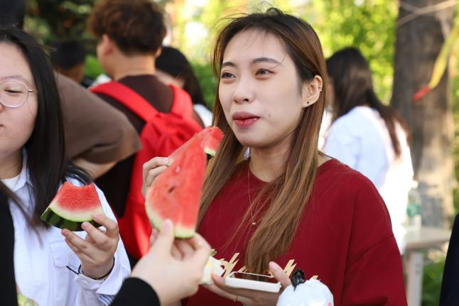 健康与护理系为毕业生们准备了西瓜、圣女果、中式点心、奶油蛋糕、曲奇饼、棒棒糖及小零食。水果、蛋糕的香气弥散开来,引人垂涎欲滴,学弟学妹们还将小零食精心摆成“毕业快乐”字样,祝愿学长们前程似锦、永远开心。