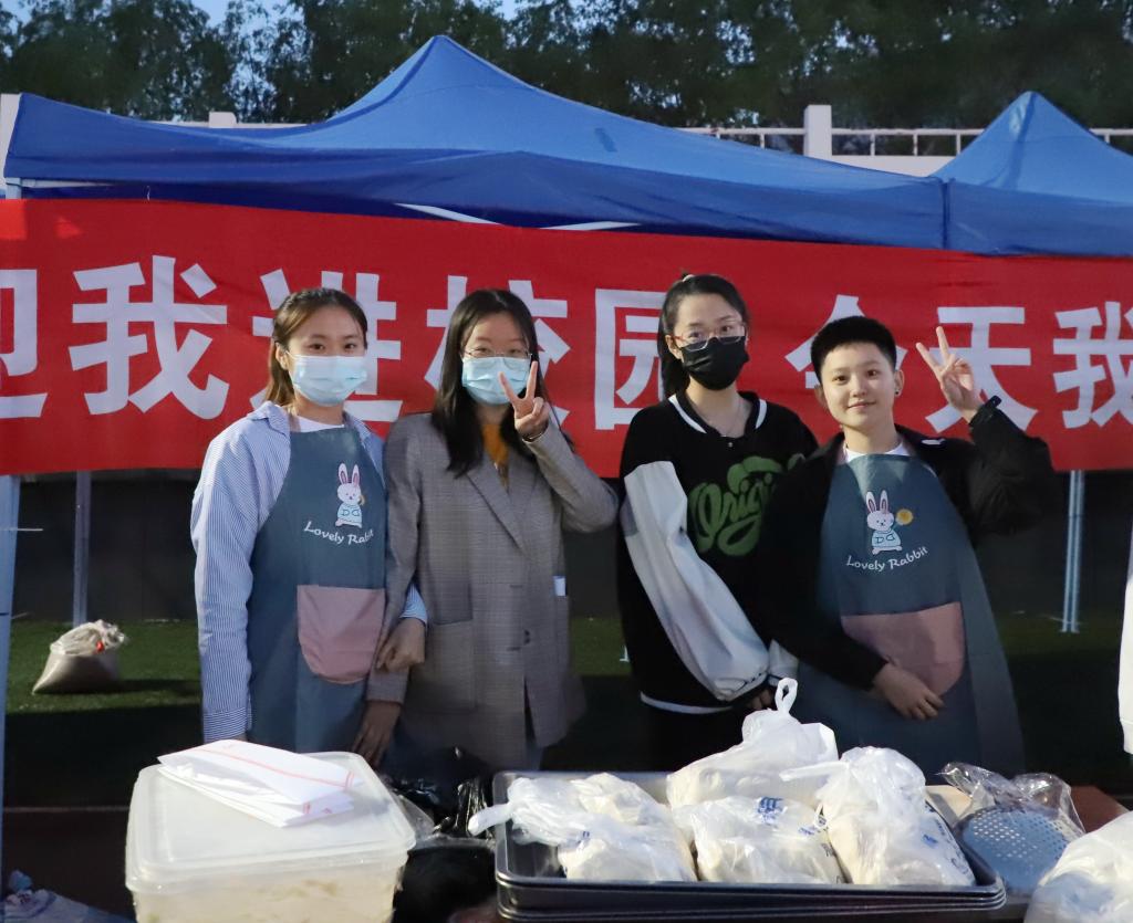 场内激情满满,场外热气腾腾,在校生为学长包饺子的环节悄悄进行。体育场西侧一排临时搭建的折叠房前,近百名学弟学妹戴着厨师帽围着白围裙,既有分工又有合作,包着猪肉葱花与酸菜肉馅的饺子为学长送行。“昔日学长迎我进校园,今天我为学长包饺子”的条幅在夜色中,格外显目,格外暖心。