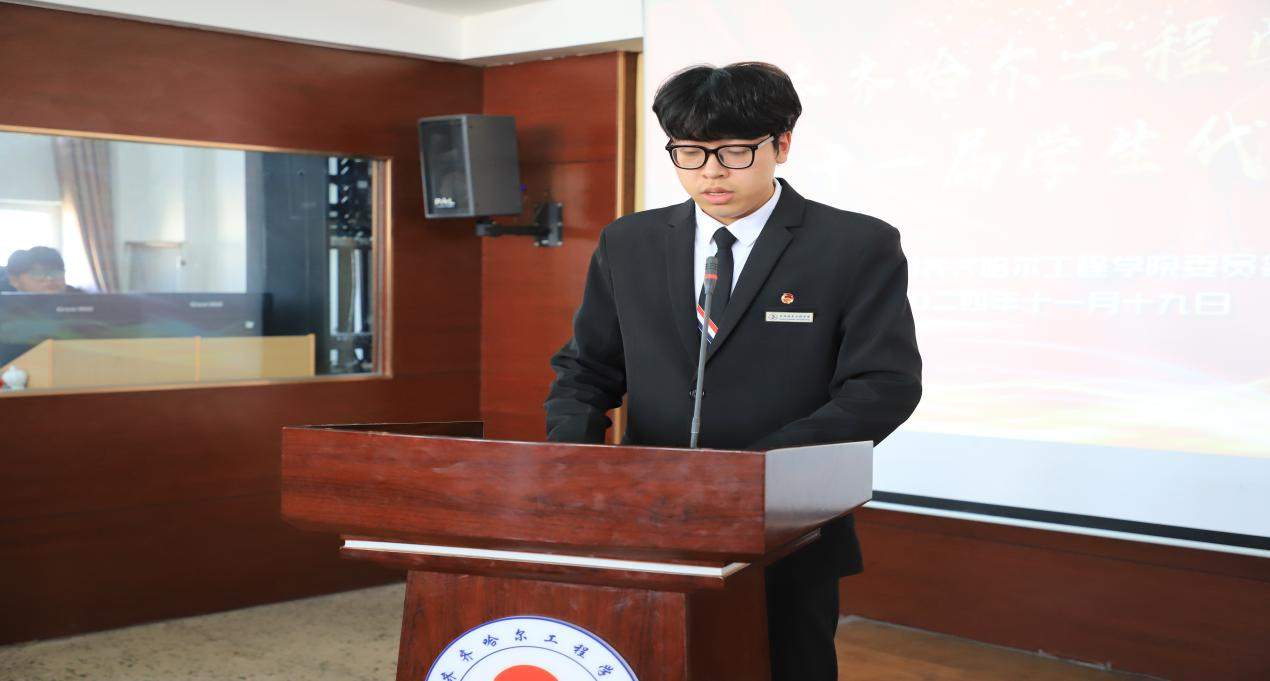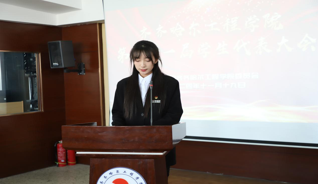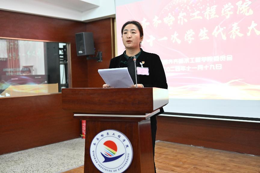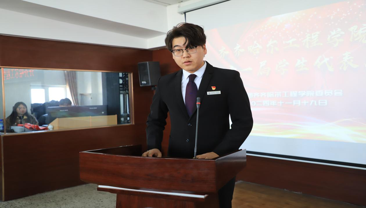 学生会执行主席杨嘉赫宣读了《齐齐哈尔工程学院第三十届学生委员会工作报告》。报告中详细回顾了过去一年学生会在学术交流、文体活动、志愿服务、权益保障等方面的工作成果,对新一届学生干部提出了明确的期望与要求。