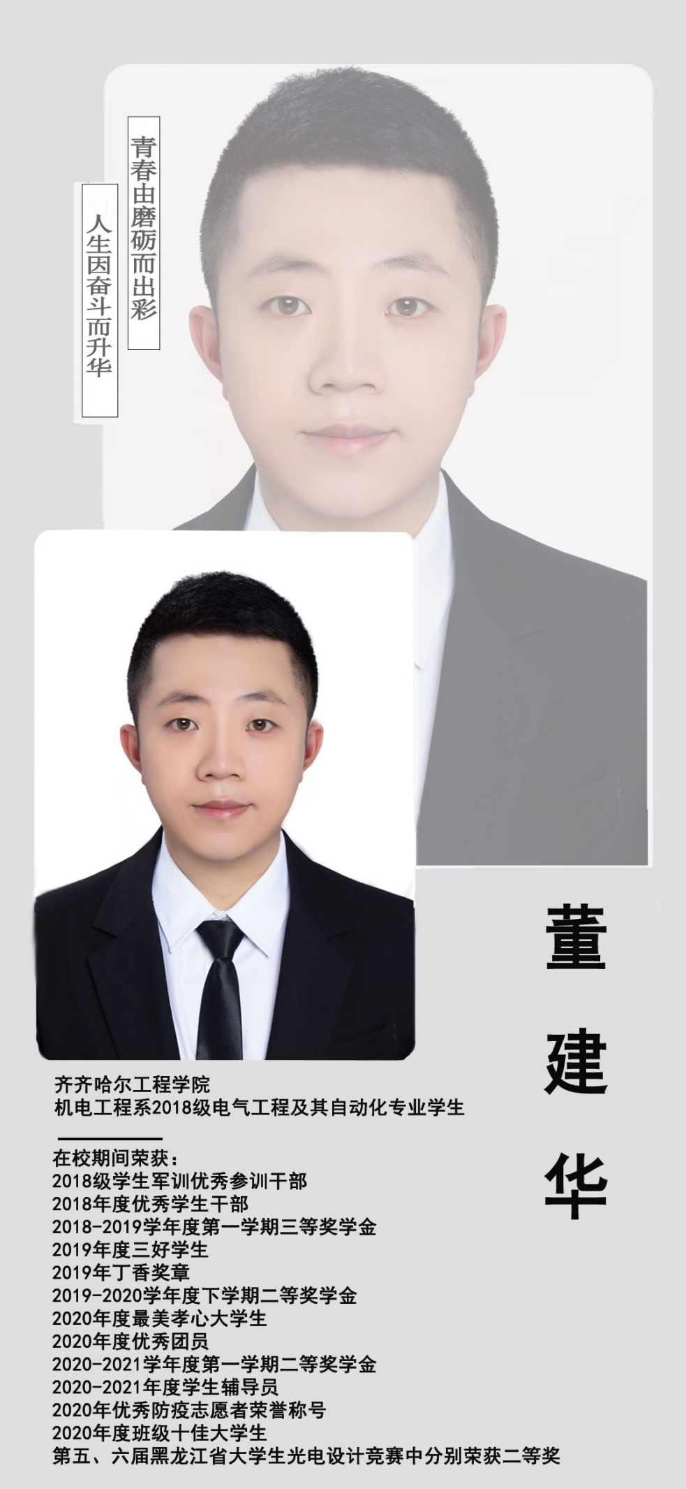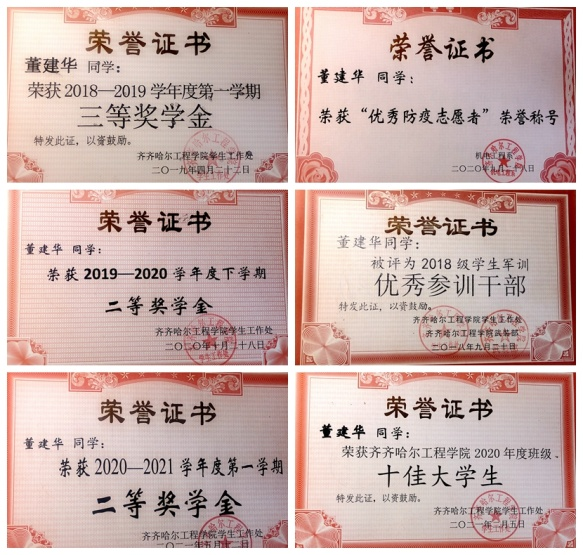 董建华的大学生活,用“硕果累累”来形容再适合不过了。丰富的参赛与获奖经历、每学年的奖学金,让他的大学时光无比充实。对他来说,选择齐齐哈尔工程学院,就是选择了丰富多彩的青春岁月;努力向上,奋斗拼搏则是他交给自己、交给青春最无悔的答卷。