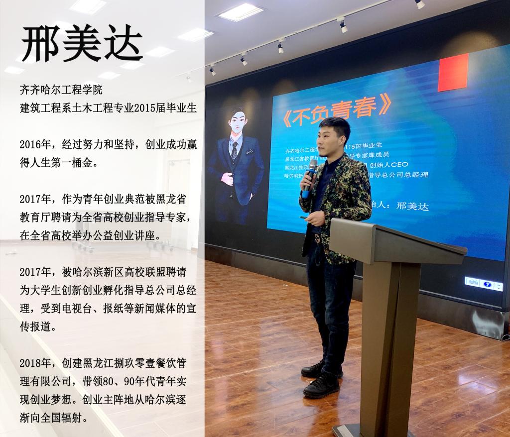 齐齐哈尔工程学院坚持理论与实践相结合,以前沿的教育教学理念,引导学生自主创新创业。正是在学校这种氛围和熏陶下,大学毕业后,邢美达放弃了稳定的事业编制工作,不顾家人的反对,坚持自己的梦想,毅然走上了创业之路。