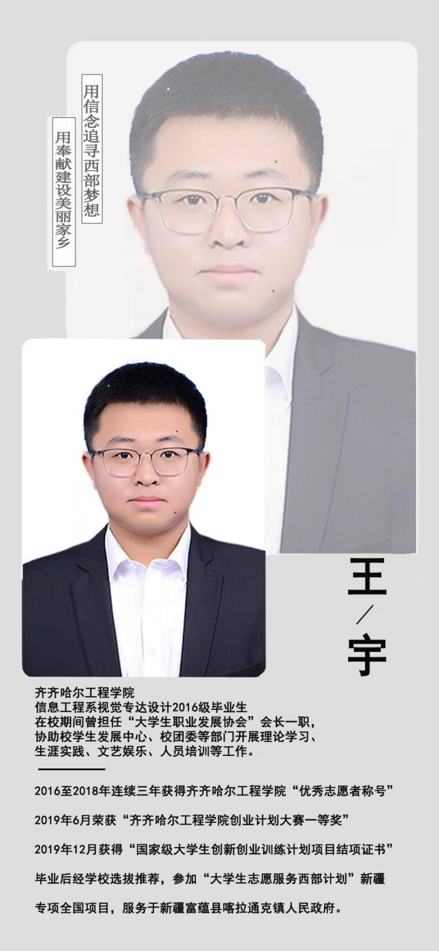 “为融入社会走进来,为服务社会走出去”,是齐齐哈尔工程学院对所有学子的殷切期盼。带着这16个字,王宇毕业后参加了西部计划,从祖国最东端到最西端,跨越4500公里,来到了新疆富蕴县,开始他的志愿服务生涯。