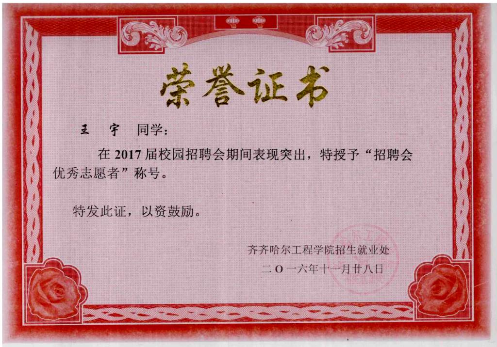 “今天的学习方式要与明天在社会的生存方式要保持一致”,是齐齐哈尔工程学院的办学理念。王宇正是看到这句话才选择了这所大学。他说:“大学的每一次成长,都离不开学校的教导与历练,更离不开学校的支持与鼓励,大学四年学校所给予我的帮助,我将一直牢记,作为学校学子更是对学校的用心教育心存感激。”