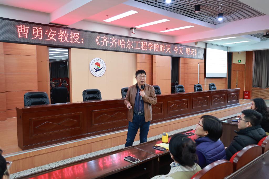 随后,创校校长、理事长曹勇安在图书馆601报告厅作题为《齐齐哈尔工程学院昨天、今天、明天》的专题讲座,调研组及校骨干学习班成员参加。曹勇安从“艰苦创校、课程立校、文化治校、精神兴校、信仰传校”五方面出发,全面回顾了学校的办学历程,系统阐述了学校独特的办学理念与文化内涵,深入剖析了办学特色在制度文化、精神文化、物质文化和行为文化上的具体体现,详细讲解了学校建设“百年老校”奋斗目标的四个发展阶段,以及产教融合中心从1.0到3.0版本的迭代升级过程,并对学校未来发展勾勒出清晰蓝图。