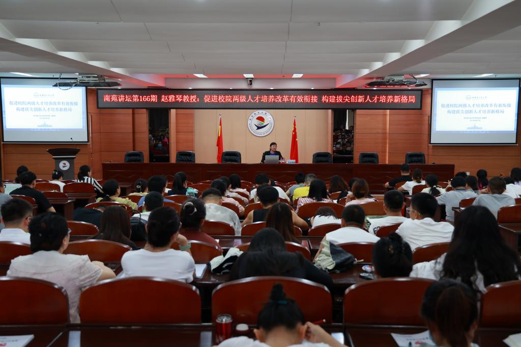 8月7日上午,学校南苑讲坛第166期在图书馆601报告厅举行,哈尔滨工业大学本科生院副院长赵雅琴教授应邀来校作《促进校院两级人才培养改革有效衔接 构建拔尖创新人才培养新格局》讲座。教务处副处长李文禹主持,学校领导、全体干部、教师聆听讲座。 赵雅琴教授首先就历史沿革、初心使命两方面介绍了哈尔滨工业大学的总体情况。随后从教育教学新形势、哈工大人才培养改革举措、二级学院人才培养管理三个方面开展讲座。赵雅琴教...