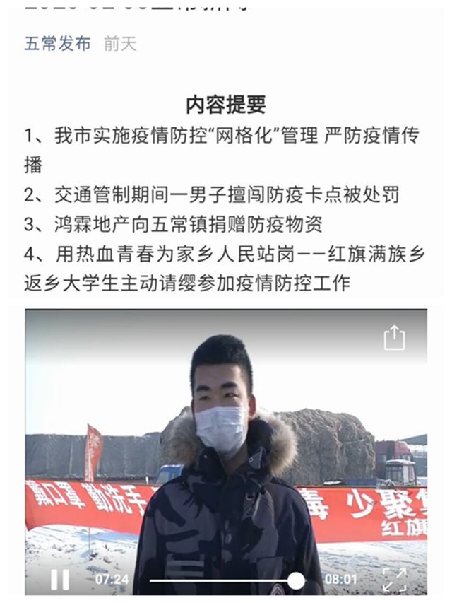 疫情防控,志愿同行,我校学生积极践行“为融入社会走进来,为服务社会走出去”的育人理念,积极投入所在地新冠肺炎疫情防控志愿服务之中。2月8日,哈尔滨五常市电视台在新闻节目中,以《用热血青春为家乡人民站岗--...