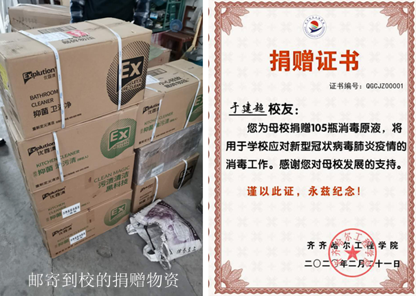 2月21日上午,我校通过学校校友会收到第一单捐赠的防疫物资——来自北京一家公司的7件共105桶、价值万元的浓缩消毒液。这对正在全力防控新冠肺炎疫情、积极筹备开学准备工作的我校师生来说,真可谓雪中送炭、情意满满...