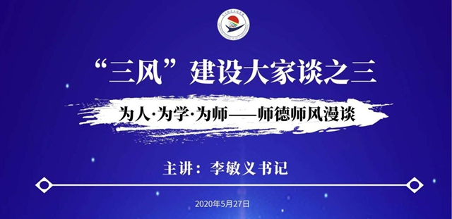 5月27日下午,“三风”建设大家谈第三讲在线举行,校党委书记李敏义作“为人·为学·为师——师德师风漫谈”专题报告,近400位教职工参加学习,张振笋副院长主持学习活动。 李敏义书记从教师职业的特殊性、教师师德的严...