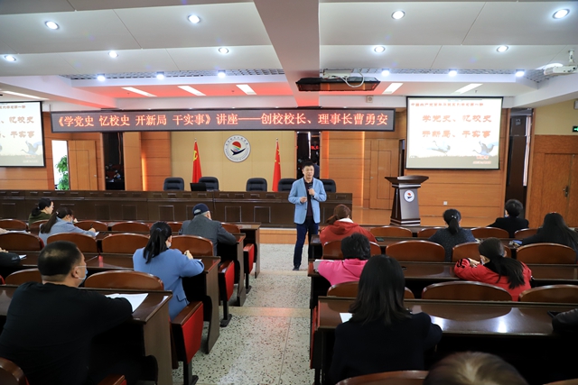 3月30日在学校图书馆601报告厅主会场,创校校长、理事长曹勇安以《学党史 忆校史 开新局 干实事》为题进行党史学习第一讲,全体教职工和学生党员、入党积极分子分别在主会场、3个分会场聆听报告,其他学生和特殊岗位...