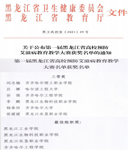 为全面贯彻落实《黑龙江省遏制艾滋病传播实施方案(2019-2022年)》文件精神,深入开展黑龙江省高校艾滋病防控相关工作,黑龙江省卫生健康委与黑龙江省教育厅联合举办了第一届黑龙江省高校预防艾滋病教育教学大赛。 ...