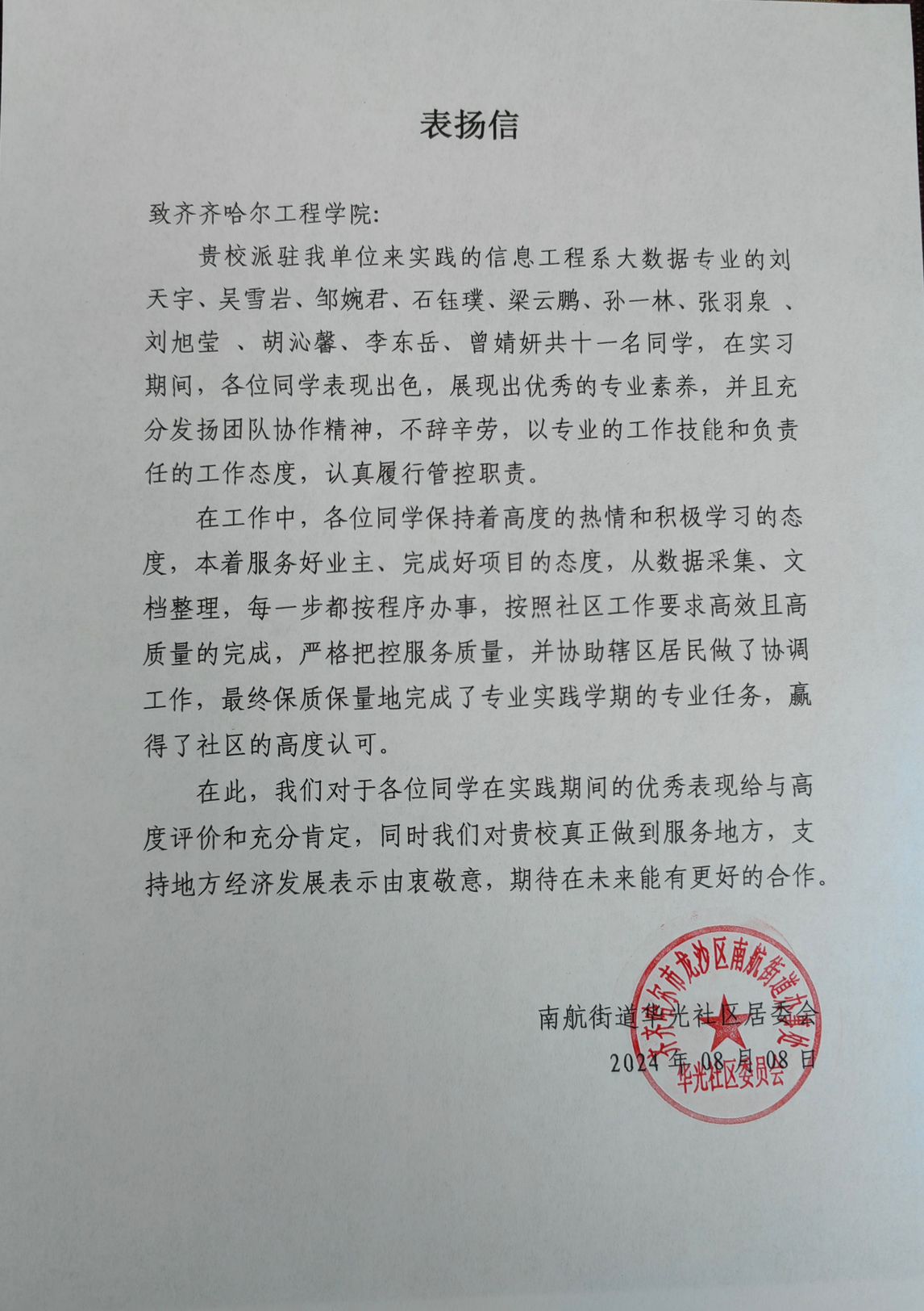 8月8日下午,信息工程系收到来自齐齐哈尔市龙沙区南航街道华光社区的表扬信,信中对大数据专业231班刘天宇、张羽泉、梁云鹏、吴雪岩、邹婉君、石钰璞、胡沁馨、孙一林、李东岳、刘旭莹、曾婧妍11名同学提出高度赞扬。这11名学生在华光社区的实践工作中,展现了突出的专业能力和团队协作精神。他们通过专业技术手段,对社区的日常运营数据进行了收集、统计和初步分析,从居民活动参与度到公共服务使用情况,每一份数据都被仔细解...