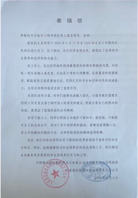 8月5日,信息工程系收到来自元道通信股份有限公司黑龙江分公司的一封表扬信,信中对在企业实践的大数据231班杨乐、宋佳蓉、徐娟慧、刘思慧、陈卓,大数据232班海晶、张雅楠、王欣玥八名学生给予高度肯定。这些学生在实践中,不仅展现了扎实的专业基础,更以积极的工作态度赢得了企业的一致好评。在实践学期中,这八名学生迅速适应了职场环境,将所学理论知识与实践紧密结合,在数据分析、模型构建、业务优化等方面发挥了重要作...