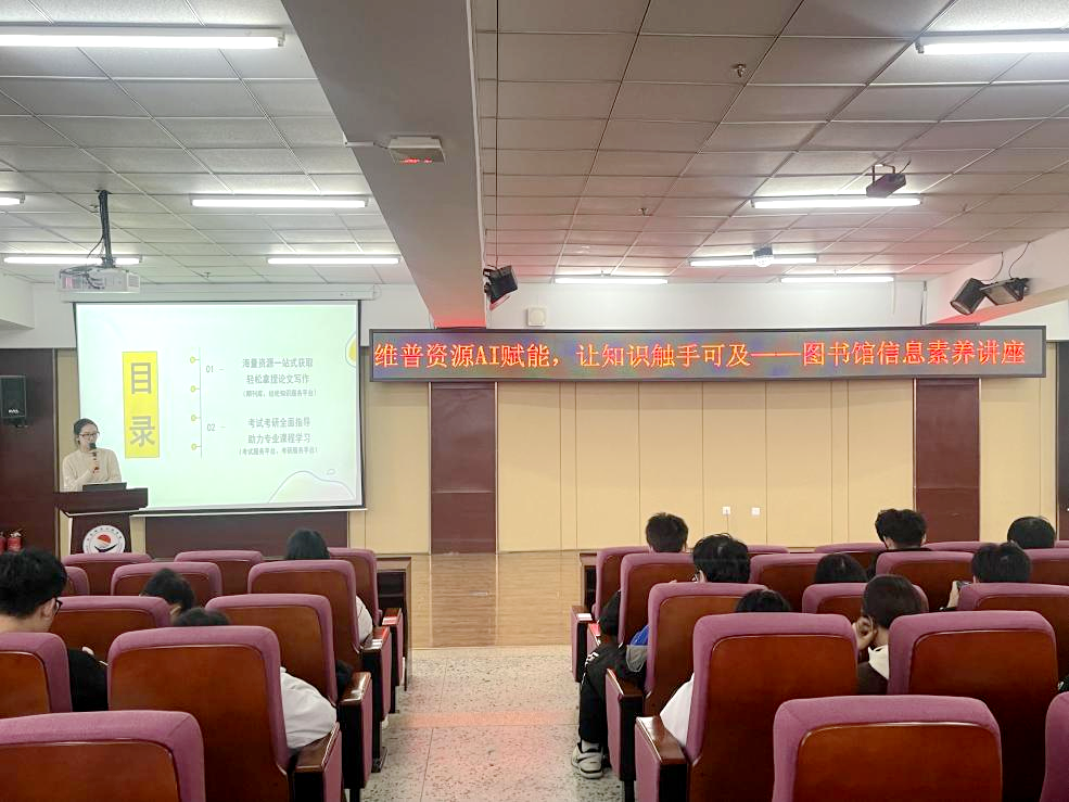 10月27至28日,在图书馆501室,由图书馆主办的“维普资源AI赋能,让知识触手可及”专题讲座,吸引了近千名学生到场参与。本次讲座由维普智图培训讲师高斯彤全程主讲。讲座中,高斯彤以“AI重构学术服务”为核心,系统演示了维普平台如何通过人工智能技术重塑资源检索、论文写作及考研备考模式。在“AI智能检索”环节,她展示了平台新增的“语义解析引擎”——AI可自动分析用户输入的关键词,智能扩展关联词并优化检索条件,同...